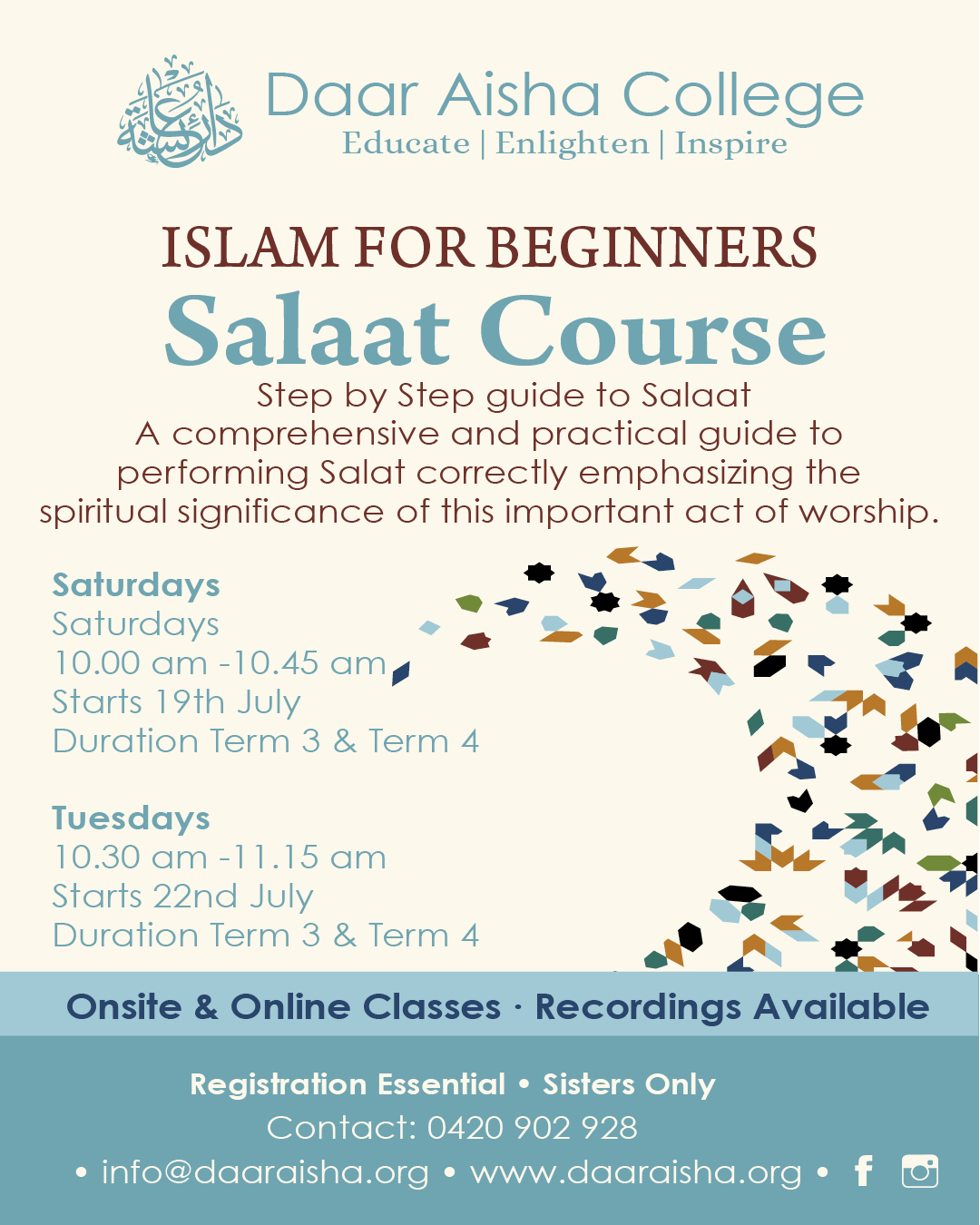 How to perform Salat step-by-step, including the Takbir, the standing, the bowing, the prostration, and the sitting. The course also includes guidance on the correct way to recite the prayers in Arabic.
