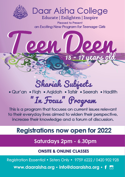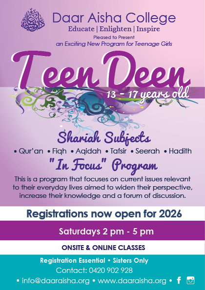 The Teen Deen Program is aimed at developing future Moral Muslims living their Islam in the western context, understanding its proper application in the context of their daily lives and the challenges they will face as Muslim Adults. This will enable them to contribute positively to our community & enhance it from an Islamic perspective.
